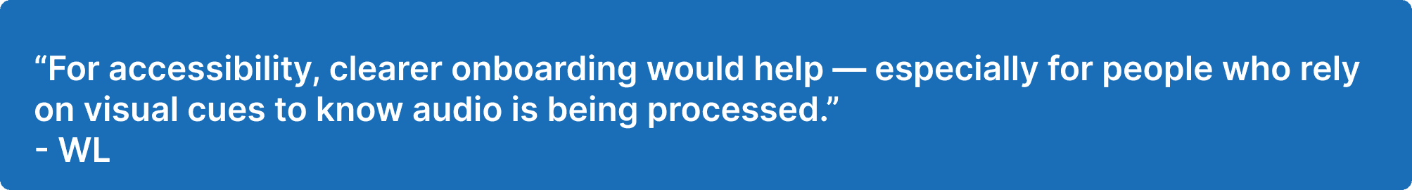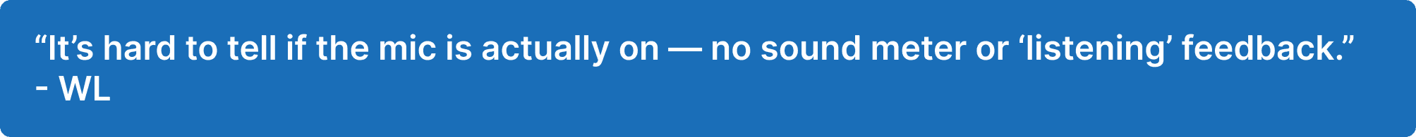 A major pain point was the lack of "listening" feedback, making it hard for users (especially those with hearing impairments) to know if the mic was active or audio was being processed.