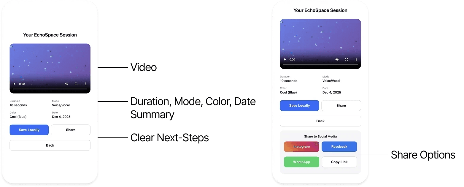 We added a 'Saves + Shares' feature, providing utility beyond the live AR experience. After each session, the user is presented with a Session Summary that includes key metadata like the video duration, the mode and color theme used, and the date. This allows users to view, export, and share a short playback snippet, turning the experience into a creative asset or a learning artifact