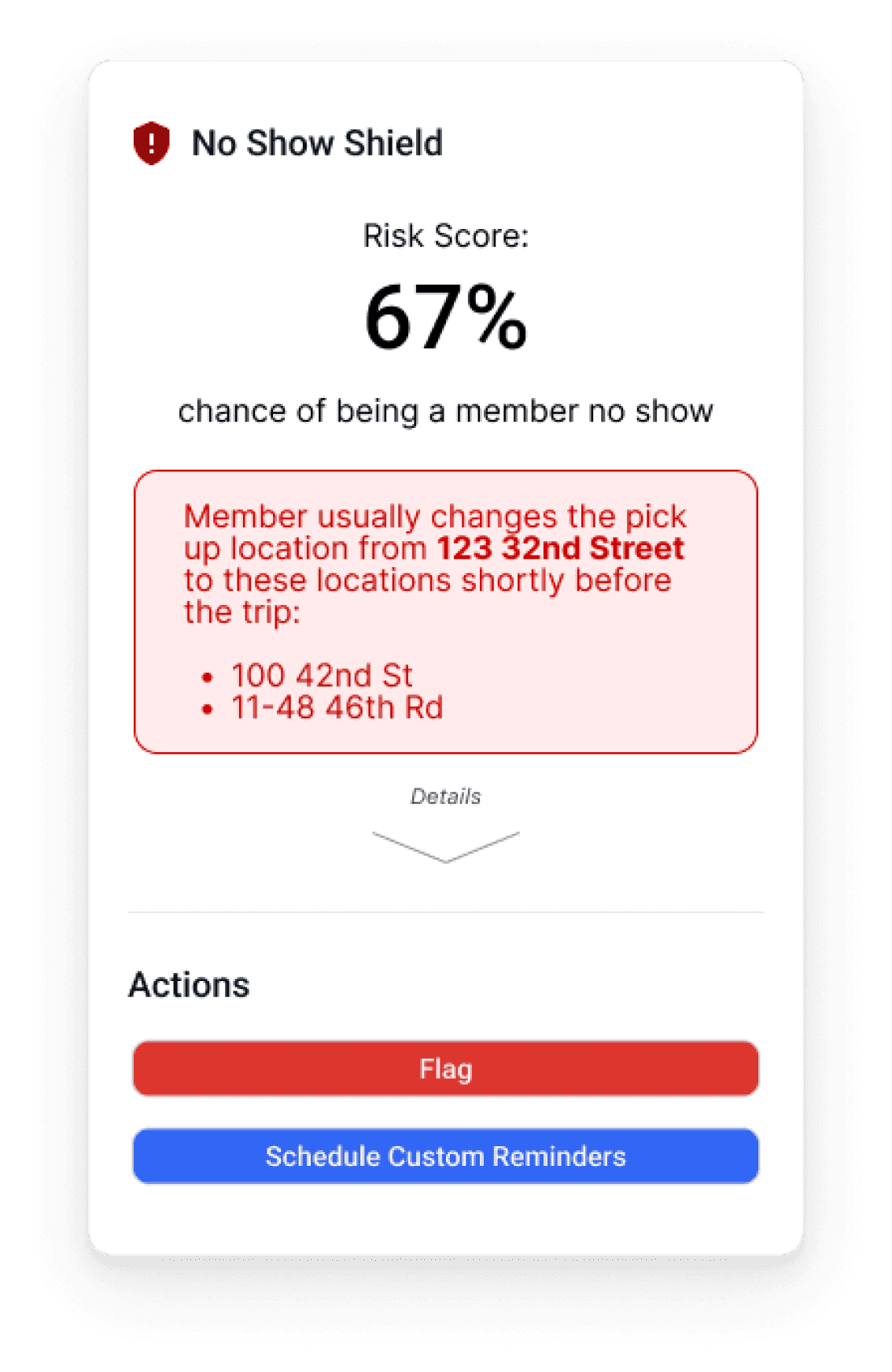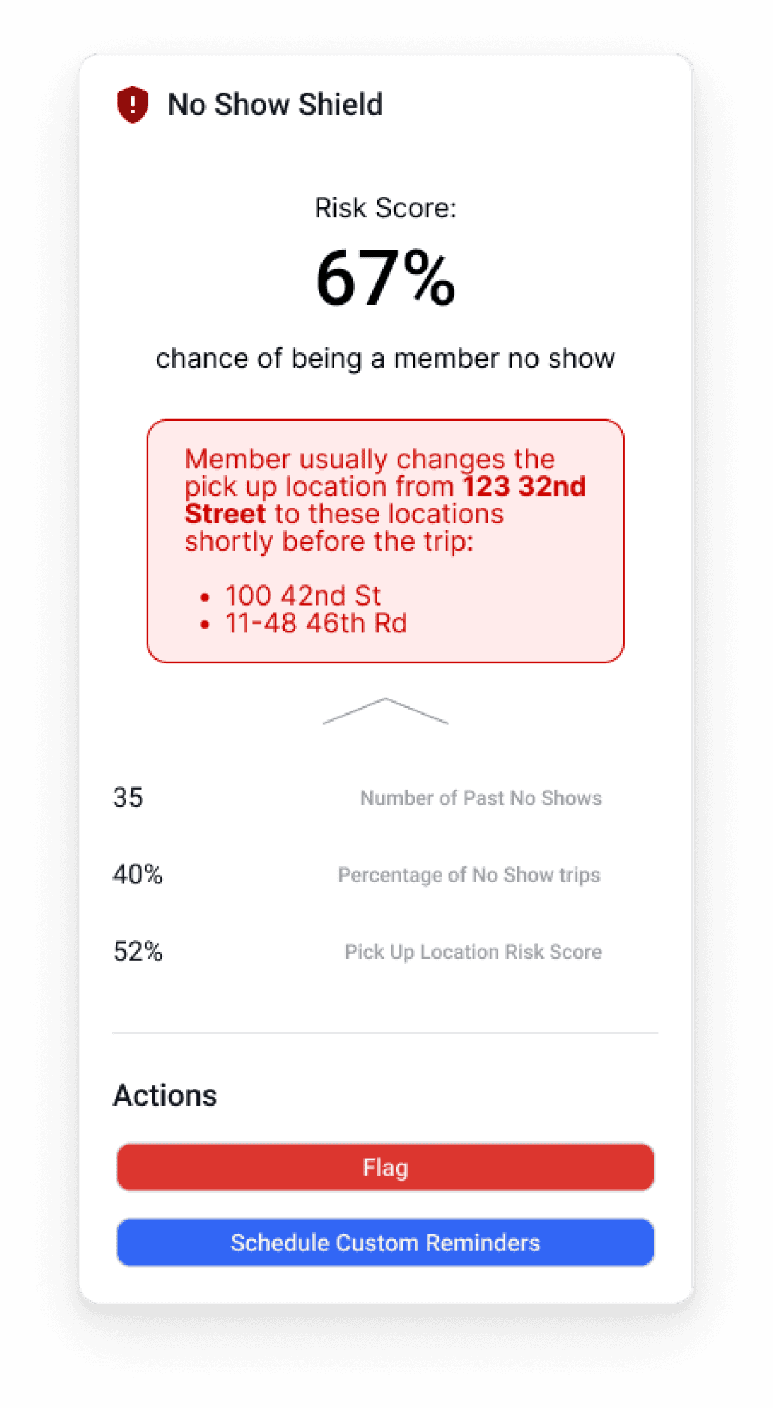 The No Show Shield would use a predictive AI model to produce a risk score that is based on data from the member's trip request and trip history. The model would take into account the trip location, scheduled day and time, and trip reason. The information would be displayed on a widget on the member's profile for a call center representative— or a trip scheduler (TS) user— to use when scheduling trips over the phone. The widget is expandable so TS users can see the breakdown of data that led to the risk score and take action— flagging the trip or setting custom reminders.