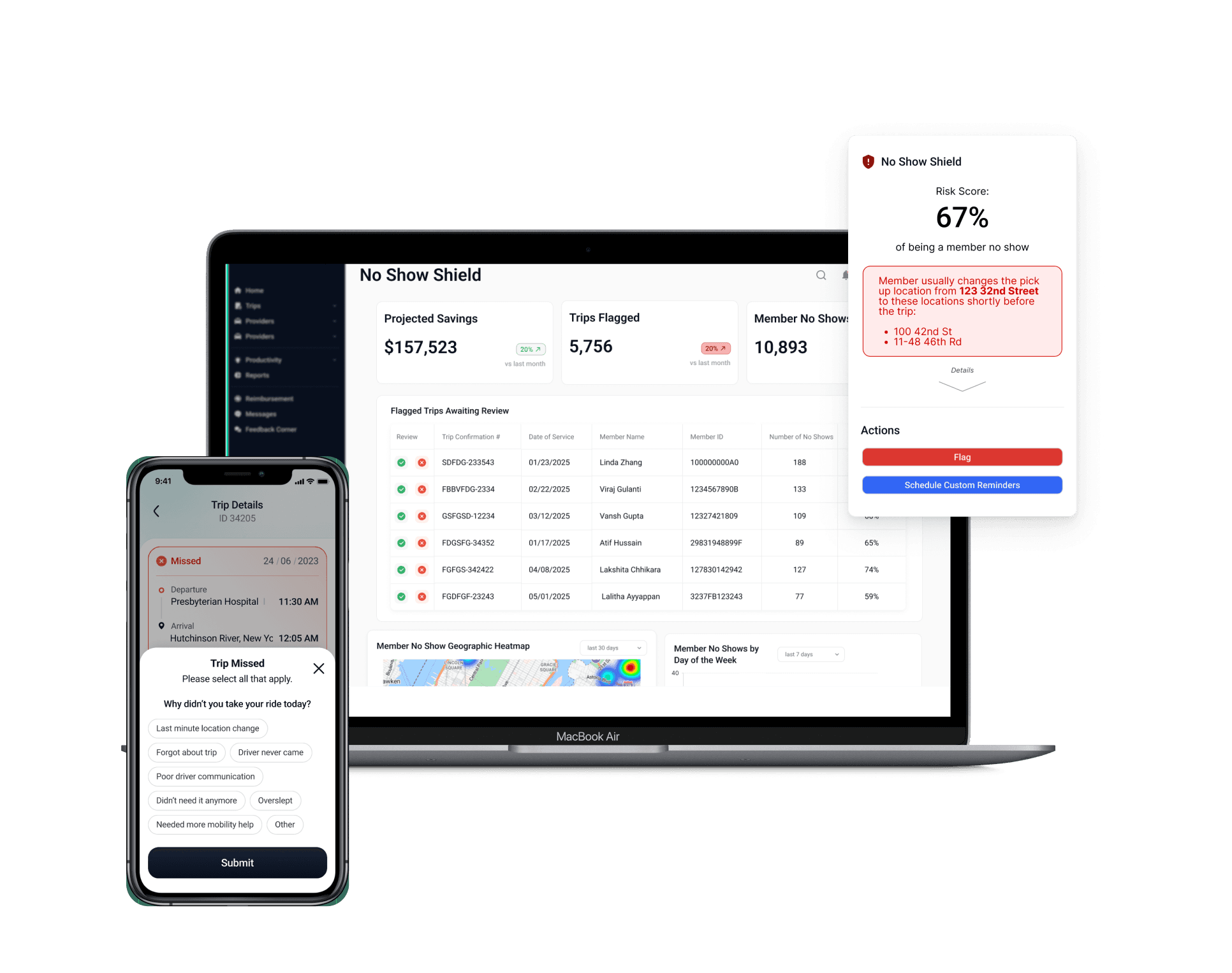 Administrators can use the No Show Shield dashboard to manage resources and review flagged trips. They can also view high level projected savings and data trends around no show trips, such as