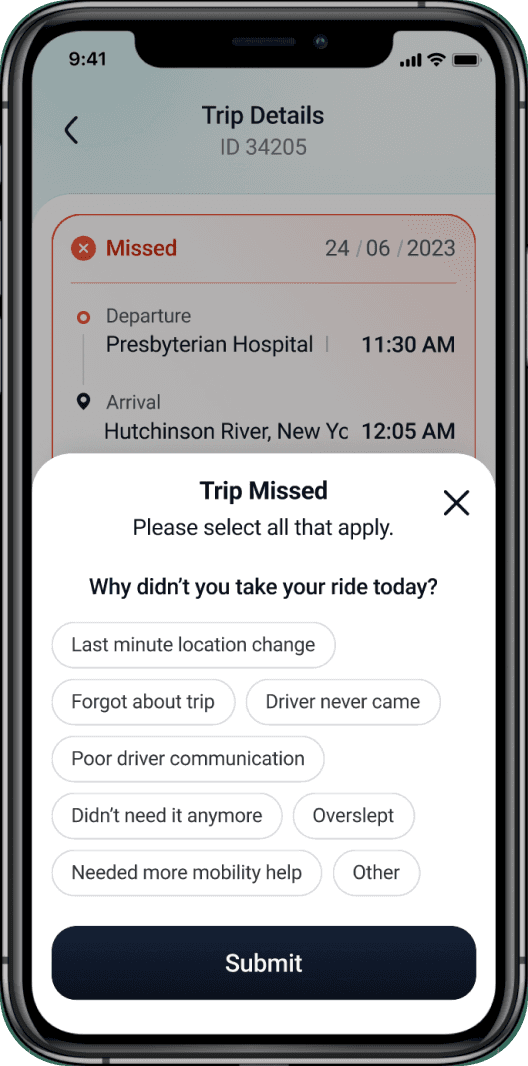 In addition to the reminders, prescribed by the predictive model, the Kinetik Health app can be improved to reduce member no shows. To collect more data to train the predictive model, I created a new "Missed" status for trips on the Kinetik Health app and a prompt asking why a member missed a trip. The member is then prompted to reschedule the trip either through call or within a reschedule flow in the app. The app saves the member's trip information, except for the date and time so that the member can edit those for their new trip.